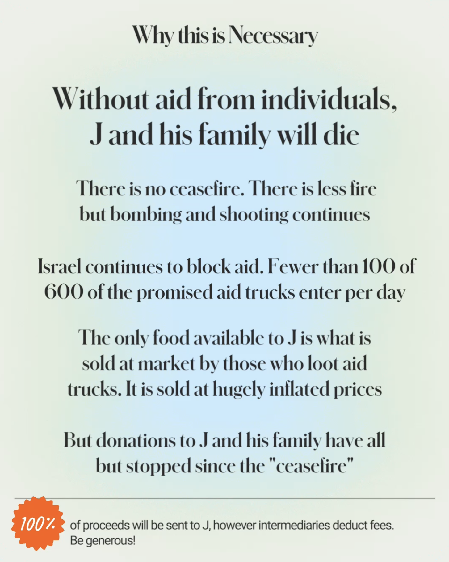 100% of proceeds benefit my friend J and his eleven family members who are struggling to survive in G*z*