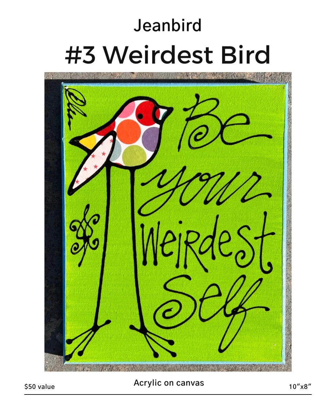 Jeanbird" paintings are mixed-media pieces, typically featuring cheerful birds with inspirational words, created by New Orleans artist Katie Leese.
